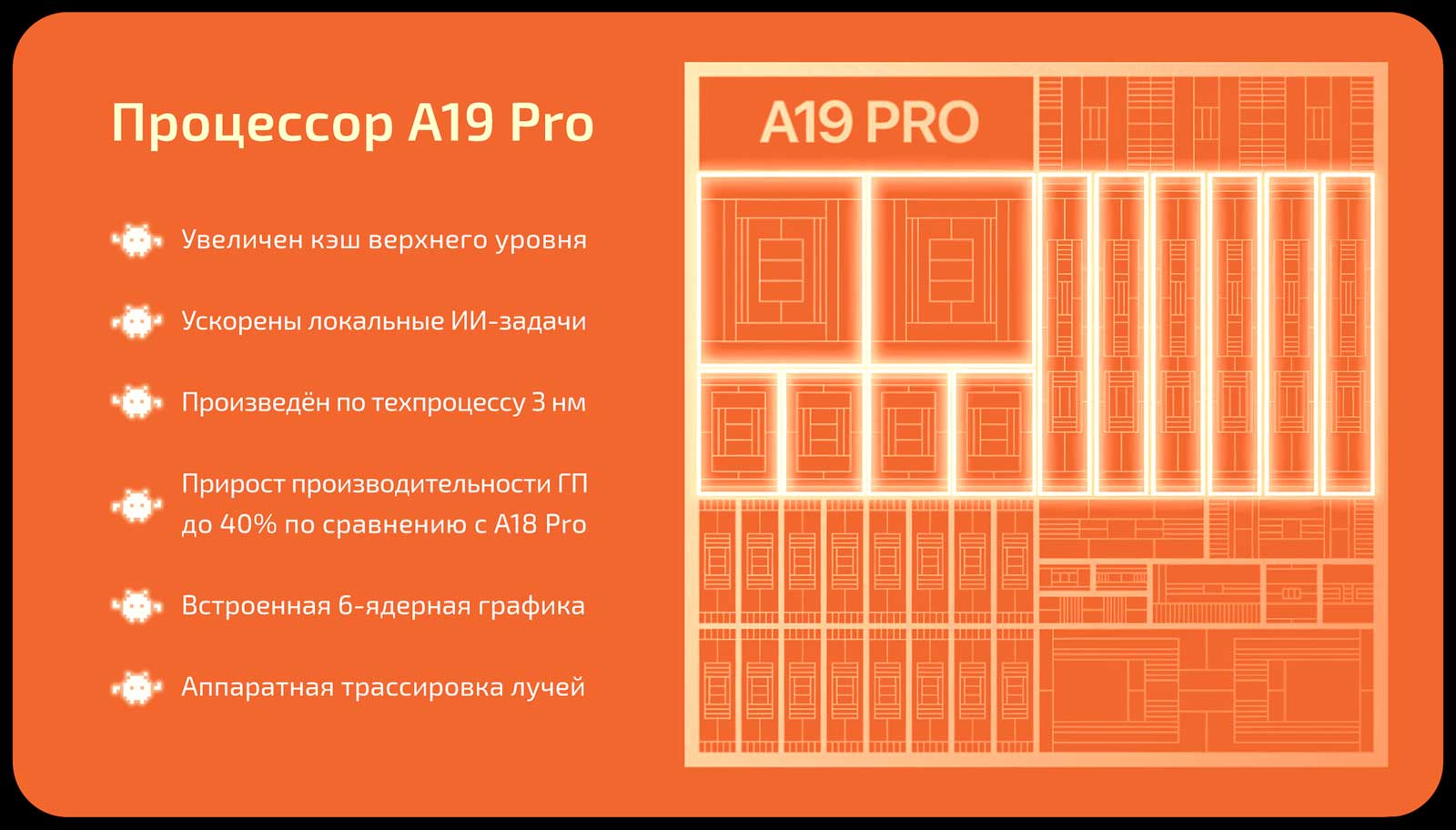 Чип A19 Pro – очередной прорыв в производительности. В повседневных задачах он быстрее предыдущего флагманского A18 Pro примерно на 10%, но графика прокачалась куда сильнее: до 40% прироста. В iPhone 17 Pro и iPhone 17 Pro Max устанавливается самая мощная версия, с 6-ядерной графикой и полным набором ускорителей машинного обучения и нейросетей. А ещё здесь 12 ГБ оперативной памяти и продуманное охлаждение: тепло отводит не только алюминиевый корпус, но и герметичная испарительная камера, изготовленная с применением лазерной пайки.