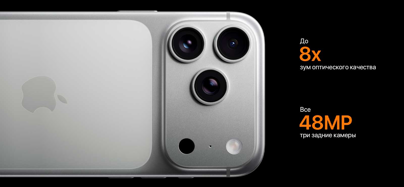 Уже давно Pro-серия iPhone – скорее камера со встроенным смартфоном, а не наоборот. В этот раз множество улучшений тоже пришлись именно на камеру. Обновились не только алгоритмы Photonic Engine, все три задние камеры iPhone 17 Pro теперь 48-Мегапиксельные, а выступ по всей ширине спинки подчёркивает акцент на съёмку (а заодно позволяет смартфону без чехла нормально лежать на столе). Сенсорная кнопка «Контроллер камеры», представленная в предыдущем поколении, тоже на месте.