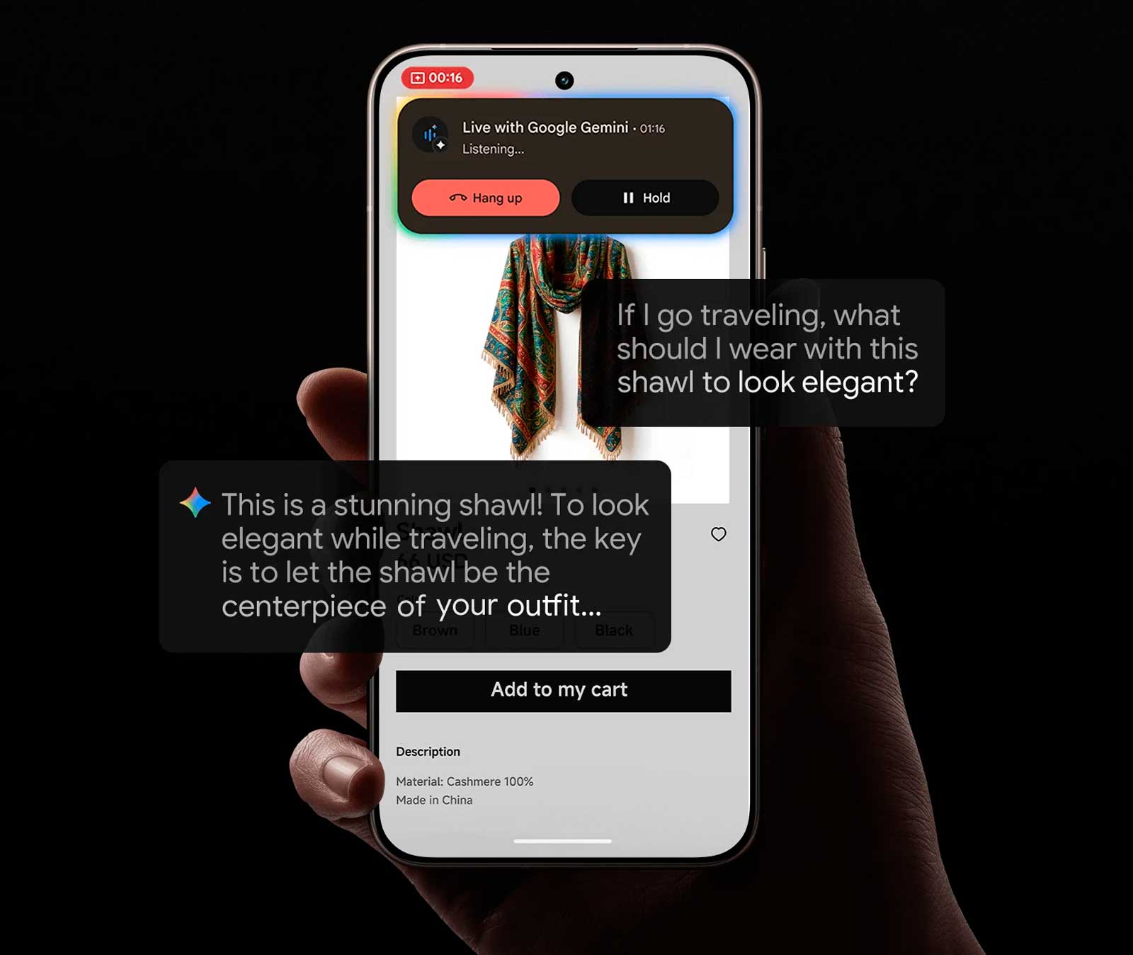 Gemini Live. Спросите Gemini обо всём, что видите. Делитесь своей камерой или экраном в живых беседах Gemini Live.