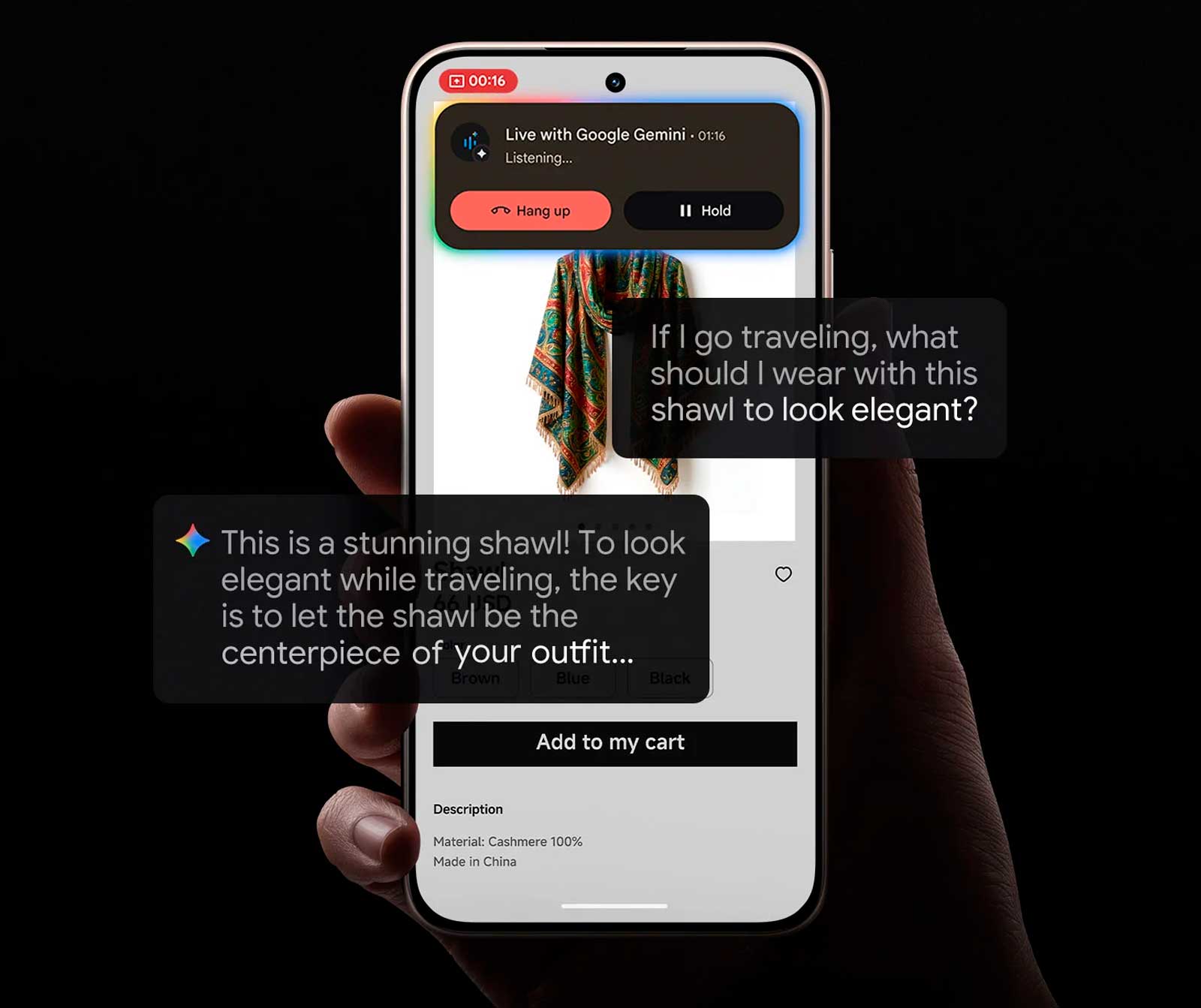 Gemini Live. Спросите Gemini обо всём, что видите. Делитесь своей камерой или экраном в живых беседах Gemini Live.
