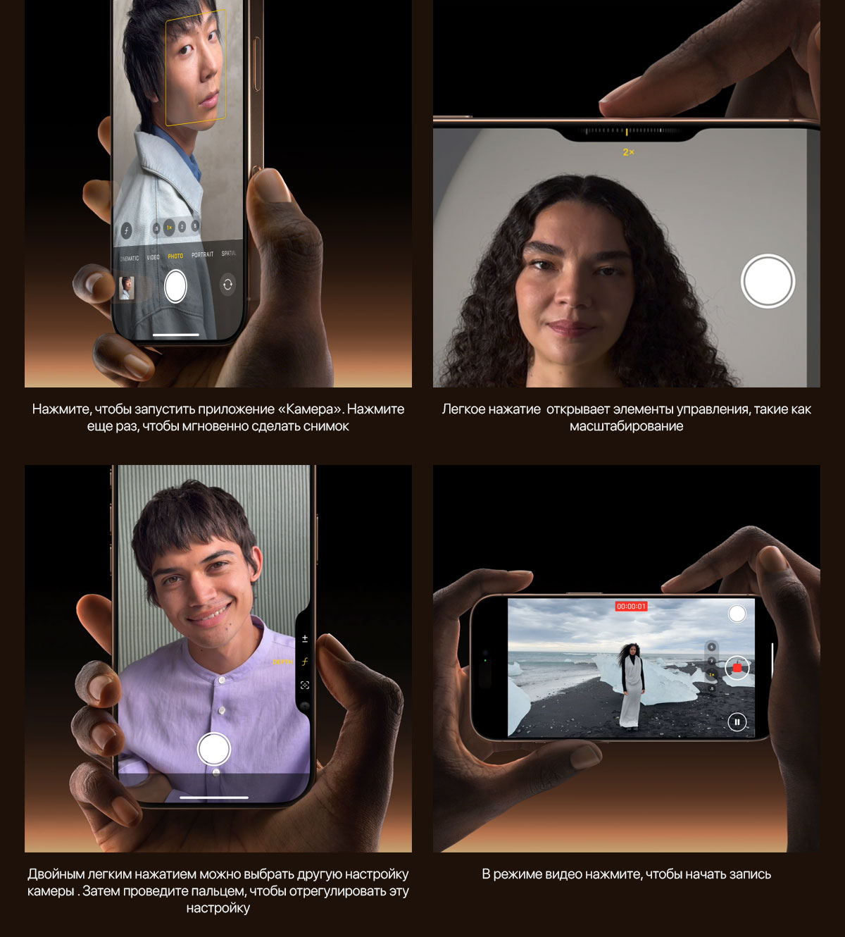 Теперь вы можете сделать идеальное фото или видео в рекордно короткие сроки. Управление камерой дает вам более простой способ быстрого доступа к инструментам камеры . Просто проведите пальцем, чтобы настроить функции камеры, такие как экспозиция или глубина резкости, и переключайтесь между каждым объективом или используйте цифровой зум, чтобы скомпоновать кадр — так, как вам нравится.