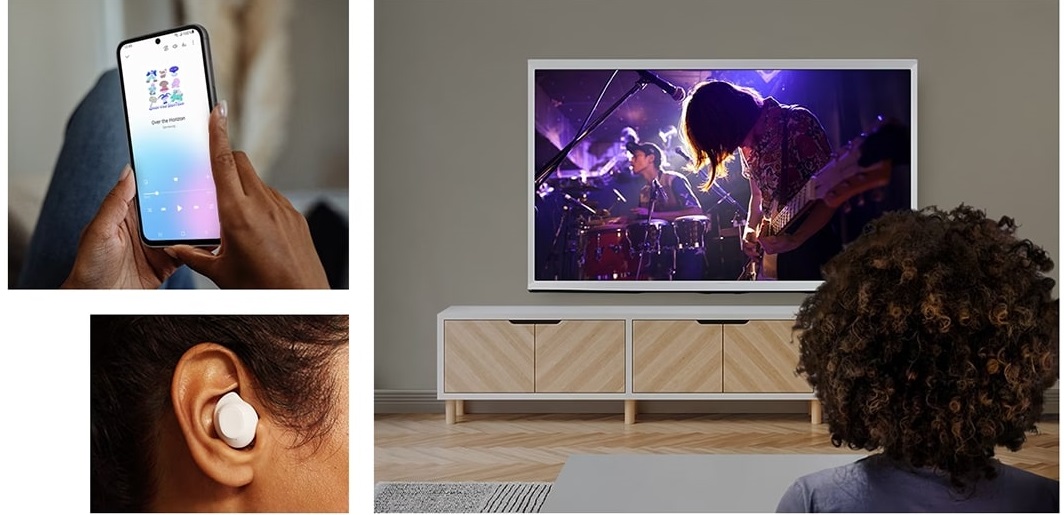 Звук беспрепятственно следует за вами, когда вы объединяетесь с другими устройствами Samsung Galaxy с помощью функции Auto Switch или подключаетесь с помощью прикосновения или Bixby. Звук остается с вами даже тогда, когда вы переключаете устройство воспроизведения со смартфона на телевизор с помощью функции Smart View, так что вы можете продолжать смотреть шоу на большом экране, не пропуская ни одного фрагмента.