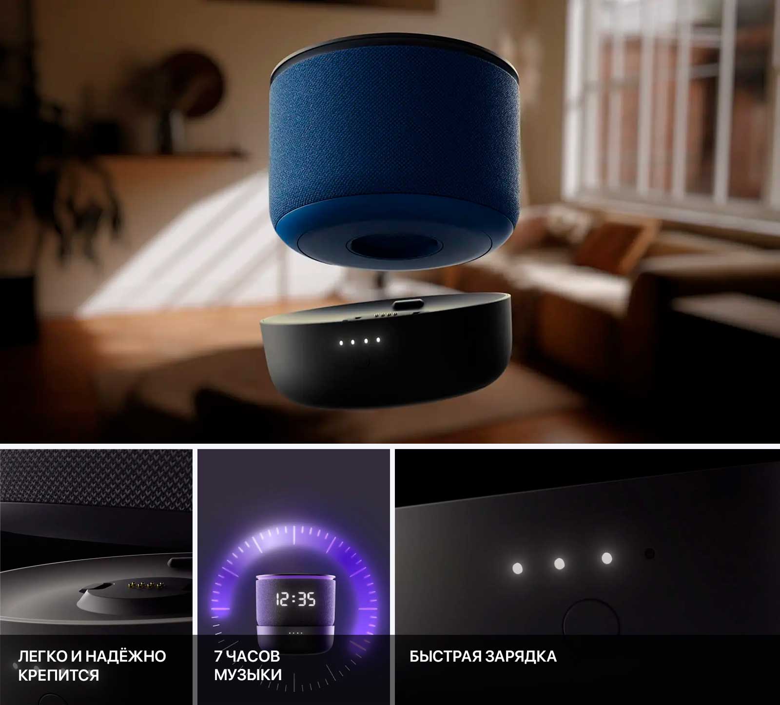 Сама колонка работает от сети. Но можно докупить портативный аккумулятор. Он крепится магнитно к колонке и обеспечивает до 7 часов автономной работы. Это удобно для тех, кто хочет переносить колонку по дому или использовать в местах без розетки. Аккумулятор также поддерживает passthrough-зарядку — он может одновременно заряжаться и питать колонку
