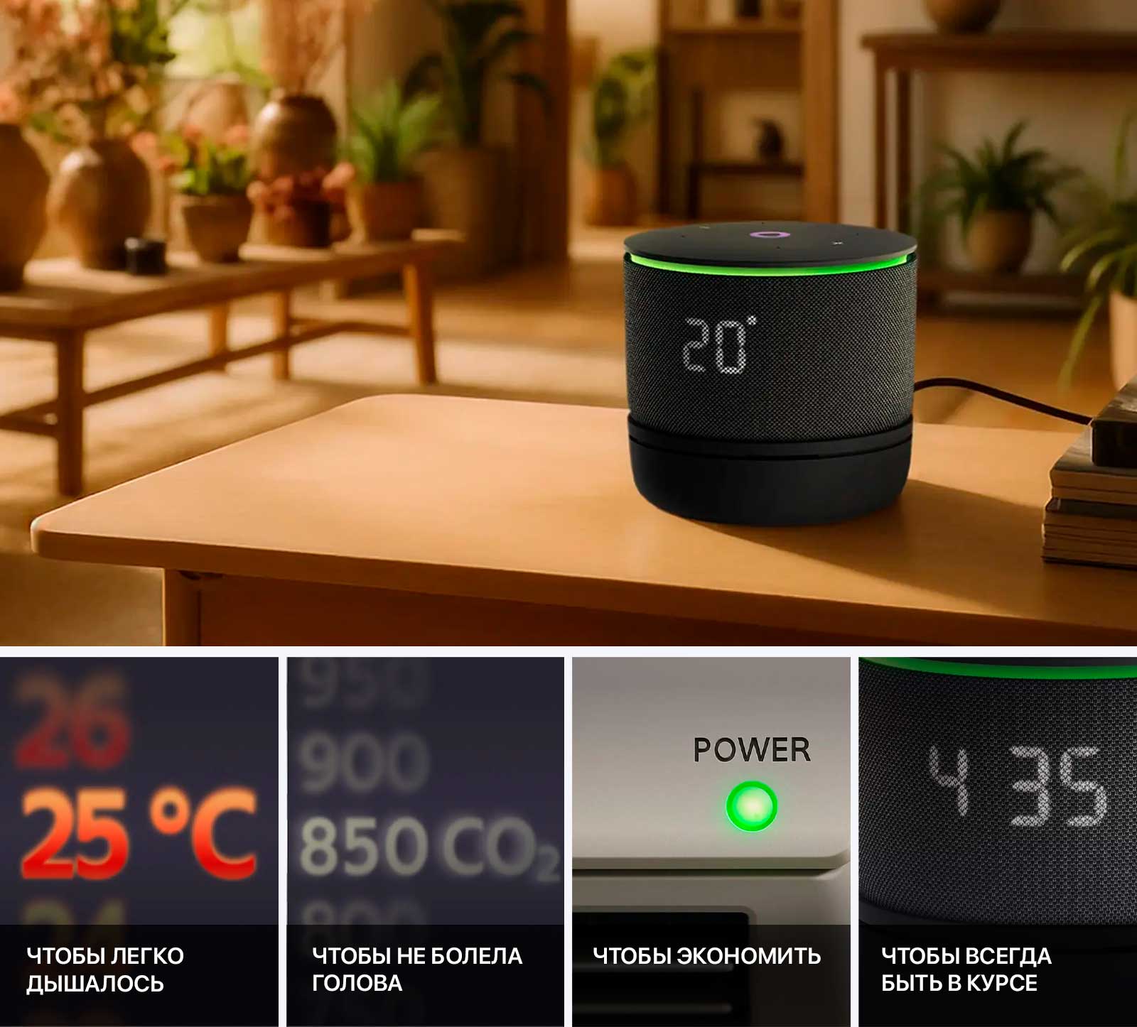 Специально для Станции Мини 3 Про создан климатический модуль* (*приобретается отдельно), превращающий её в умную систему, которая сама мониторит уровень углекислого газа, температуры и влажности. Просто присоедините его к умной колонке с помощью магнитного крепления и настройте удобные сценарии с совместимыми устройствами