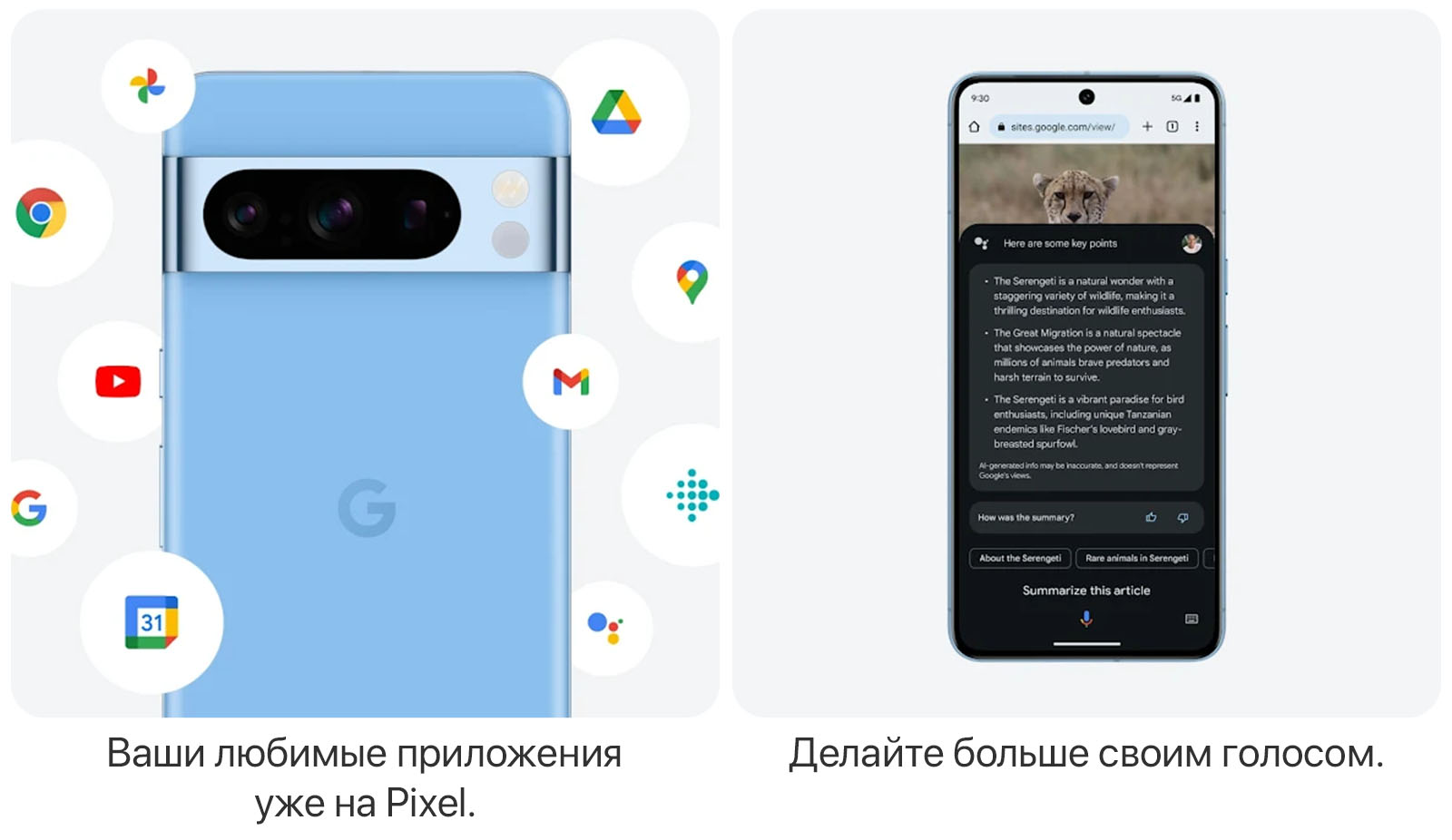 Попросите Google Assistant подвести итог, прочитать вслух или перевести веб-страницы. И пишите сообщения голосом в два раза быстрее. Благодаря иммерсивному просмотру Google Maps теперь предоставляет вам богатый, подробный предварительный просмотр пункта назначения или маршрута, чтобы помочь вам спланировать его заранее. Gmail предоставляет полезные подсказки и предложения, которые помогут вам писать, отправлять электронные письма и расставлять приоритеты. Pixel поставляется с приложениями, которые вы используете чаще всего. И они работают с Google AI, чтобы помочь вам делать все, что вы делаете, очень умными способами.